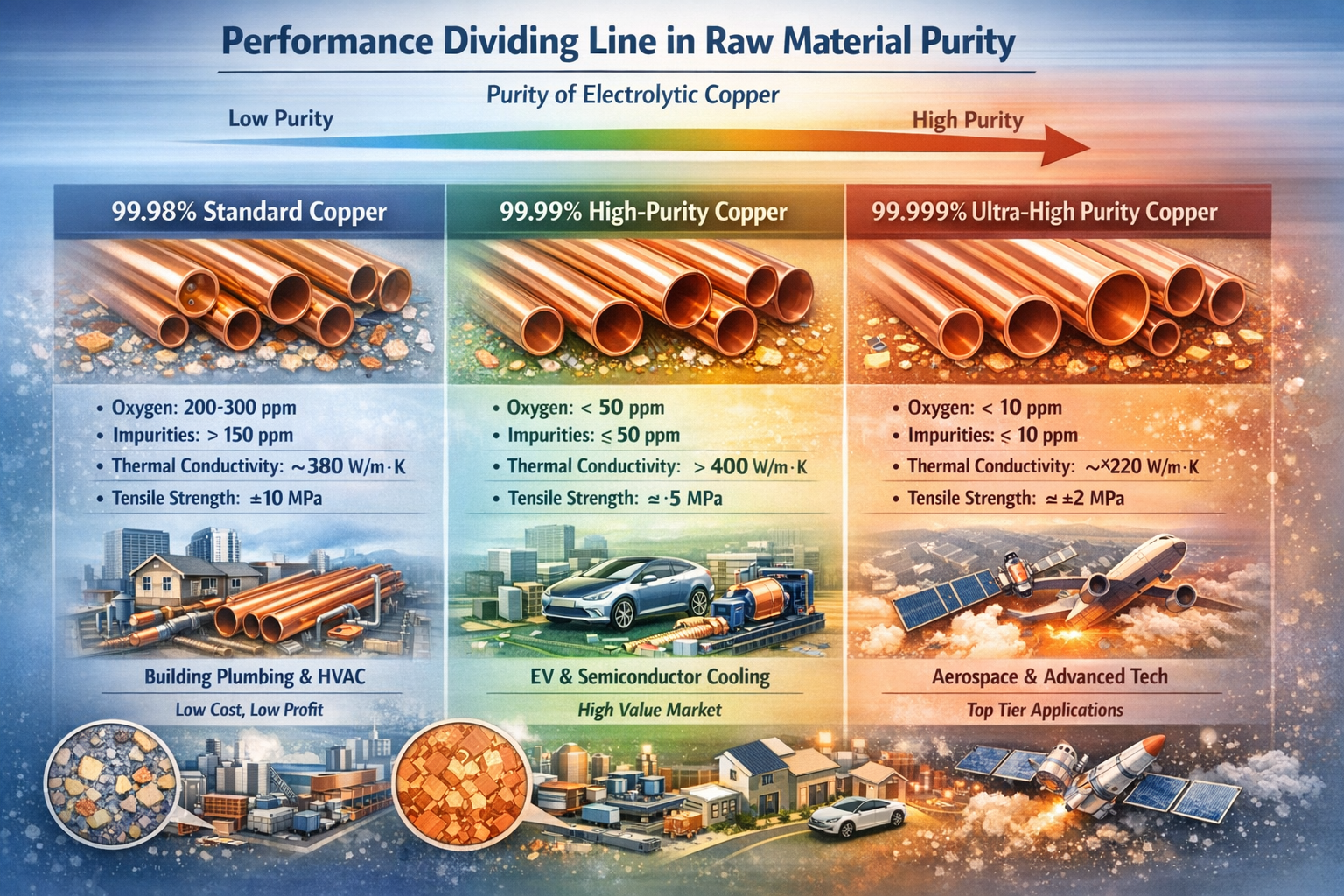 | سطح خلوص مواد خام | محتوای ناخالصی اصلی (ppm) | عملکرد لوله مسی پس از پردازش | سناریوهای قابل اجرا | هزینه تهیه مواد اولیه (RMB/ton) | سود محصول در هر تن (RMB) | نرخ نقص محصول |