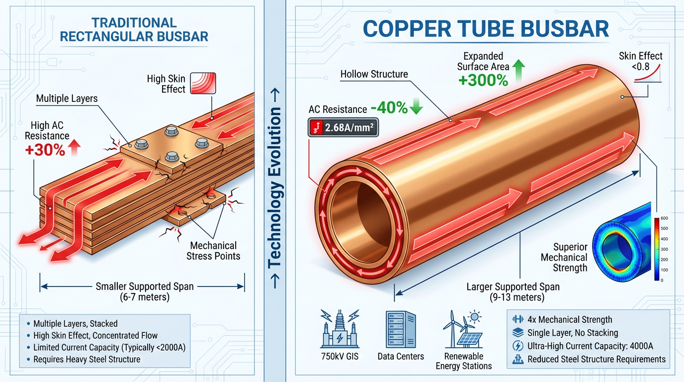 در سال 2025، ارتقاء زیرساخت های انرژی جهانی باعث رشد انفجاری در این کشور شده است لوله مسی بازار اتوبوس اگرچه این دسته تنها 2% تا 3% از کل تقاضای لوله مسی را به خود اختصاص می دهد، اما کاربرد آن در پست های ولتاژ فوق العاده بالا، مراکز داده و نیروگاه های انرژی جدید با نرخی بیش از 200% سالانه در حال رشد است. در مقایسه با شینه های مستطیلی سنتی، رقابت اصلی از شینه های لوله مسی مزایای فیزیکی ساختار لوله ای توخالی آنها نهفته است: سطح هادی را 3 تا 5 برابر گسترش می دهد، اطمینان حاصل می کند که جریان به طور یکنواخت در امتداد دیواره لوله توزیع می شود، ضریب اثر پوستی را به زیر 0.8 کاهش می دهد، و مقاومت AC را تا 40٪ در مقایسه با شینه های مستطیلی با سطح مقطع مشابه کاهش می دهد.