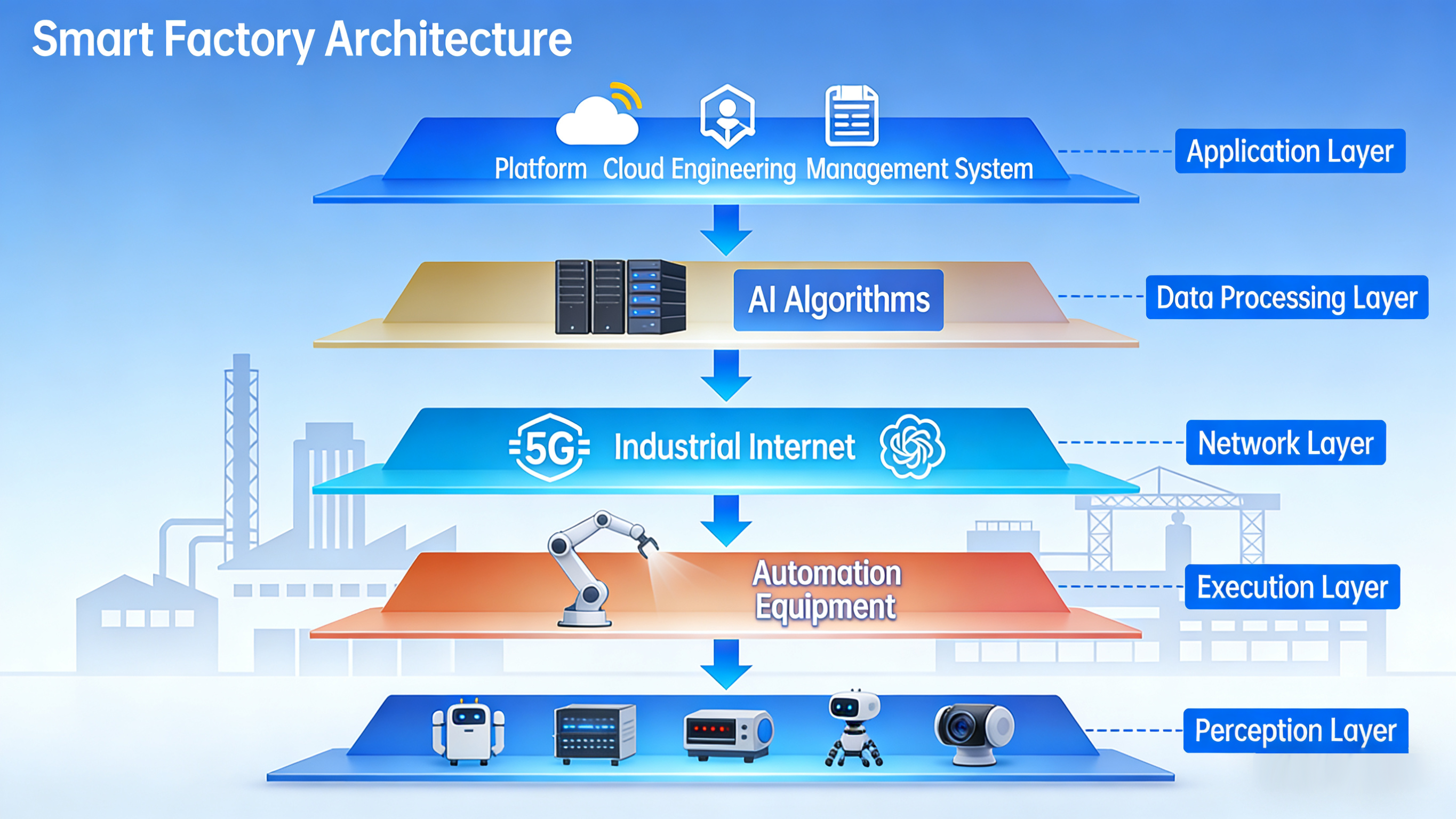 شکل: معماری کارخانه هوشمند معمولاً شامل لایههای ادراک، شبکه، پردازش داده، اجرا و کاربرد است که جریان دادهها را از حسگرها به پلتفرمهای ابری امکانپذیر میسازد.