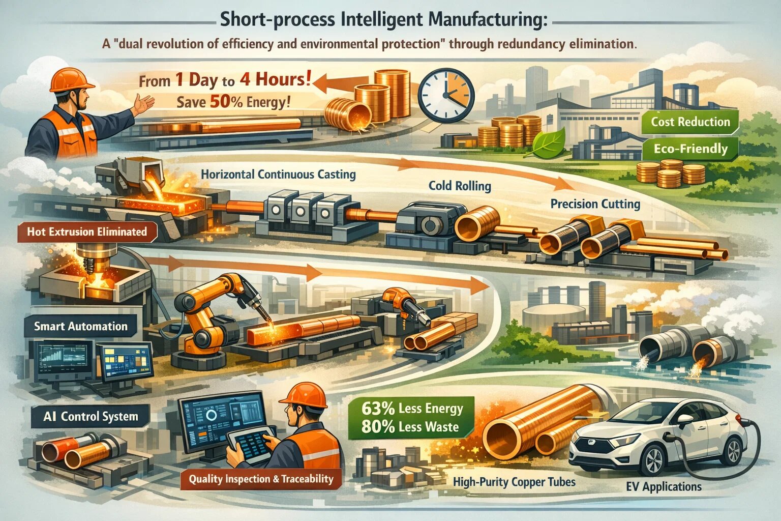 قبلاً تولید یک دسته از لولههای مسی دقیق یک روز کامل طول میکشید، اما اکنون میتوانیم آنها را تنها در 4 ساعت ارسال کنیم و نیمی از برق را صرفهجویی میکنیم.» رئیس کارگاه لوله مس JinXin در Taicang، Jiangsu، با اشاره به خط تولید کاملاً خودکار گفت. در سال 2025، «فناوری تولید با فرآیند کوتاه برای لولههای آلیاژ مس» که به طور مشترک توسط این شرکت و دانشگاه مرکزی جنوبی توسعه داده شد، گواهینامه در سطح ملی را دریافت کرد. این فرآیند بدون اکستروژن "ریخته گری مداوم افقی شمش های توخالی - نورد سرد - کشش" روش های تولید سنتی را کاملاً متحول کرد.