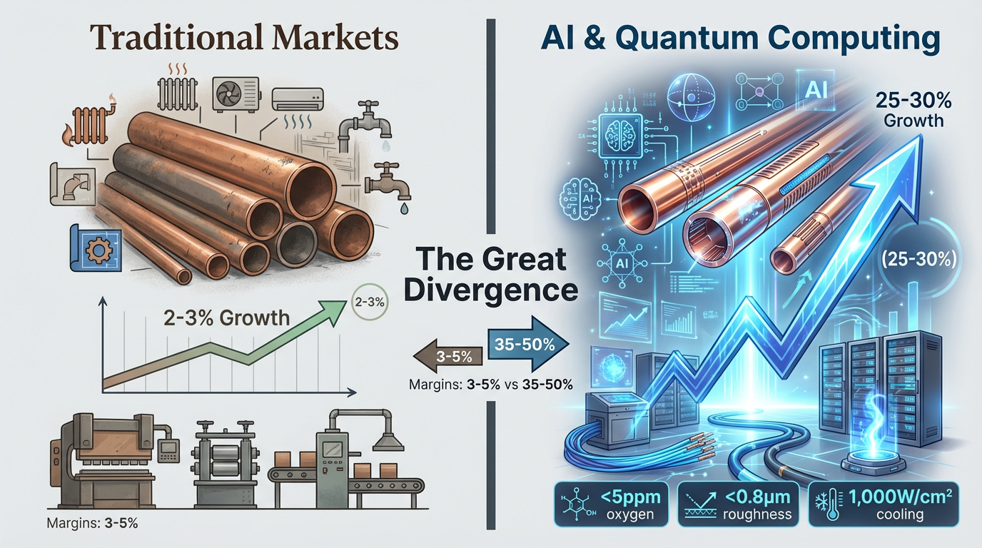 جهانی لوله مسی صنعت در حال تجربه تکه تکه شدن بی سابقه است. در حالی که ساخت و ساز سنتی و برنامه های کاربردی HVAC رشد متوسط 2-3٪ در سال، تقاضا برای لوله های دقیق در تولید نیمه هادی، زیرساخت هوش مصنوعی و محاسبات کوانتومی سالانه 25 تا 30 درصد افزایش می یابد. این واگرایی یک بازار دو لایه ایجاد می کند: تولیدکنندگان فله با 3-5٪ حاشیه دست و پنجه نرم می کنند، در حالی که تولید کنندگان تخصصی حاشیه ناخالص 35-50٪ را برای لوله هایی که دارای مشخصات شدید هستند دارند.