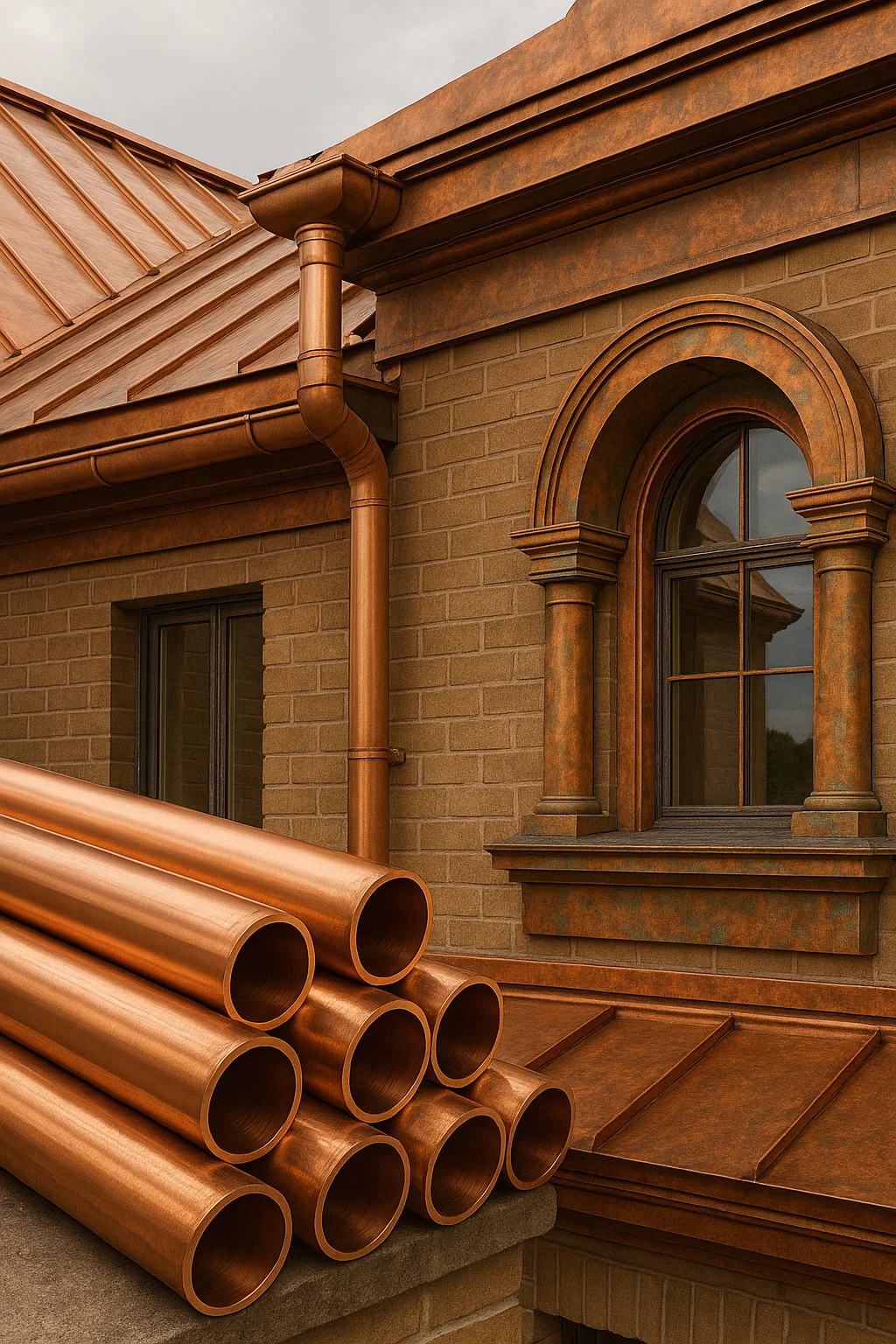در صنعت ساخت و ساز از لوله های مسی هم برای اهداف کاربردی و هم برای زیبایی استفاده می شود. در طرحهای معماری، مس به دلیل ظاهر جذابش، بهویژه زمانی که در معرض هوا قرار میگیرد، ارزش دارد که به آن پتینهای متمایز میدهد. لوله های مسی معمولاً در سقف ها، سیستم های زهکشی و ویژگی های تزئینی استفاده می شوند. طول عمر مس، همراه با مقاومت آن در برابر هوا، خوردگی و آتش، تضمین می کند که ساختمان های مجهز به عناصر مسی یکپارچگی ساختاری و جذابیت زیبایی شناختی خود را در طول زمان حفظ کنند.