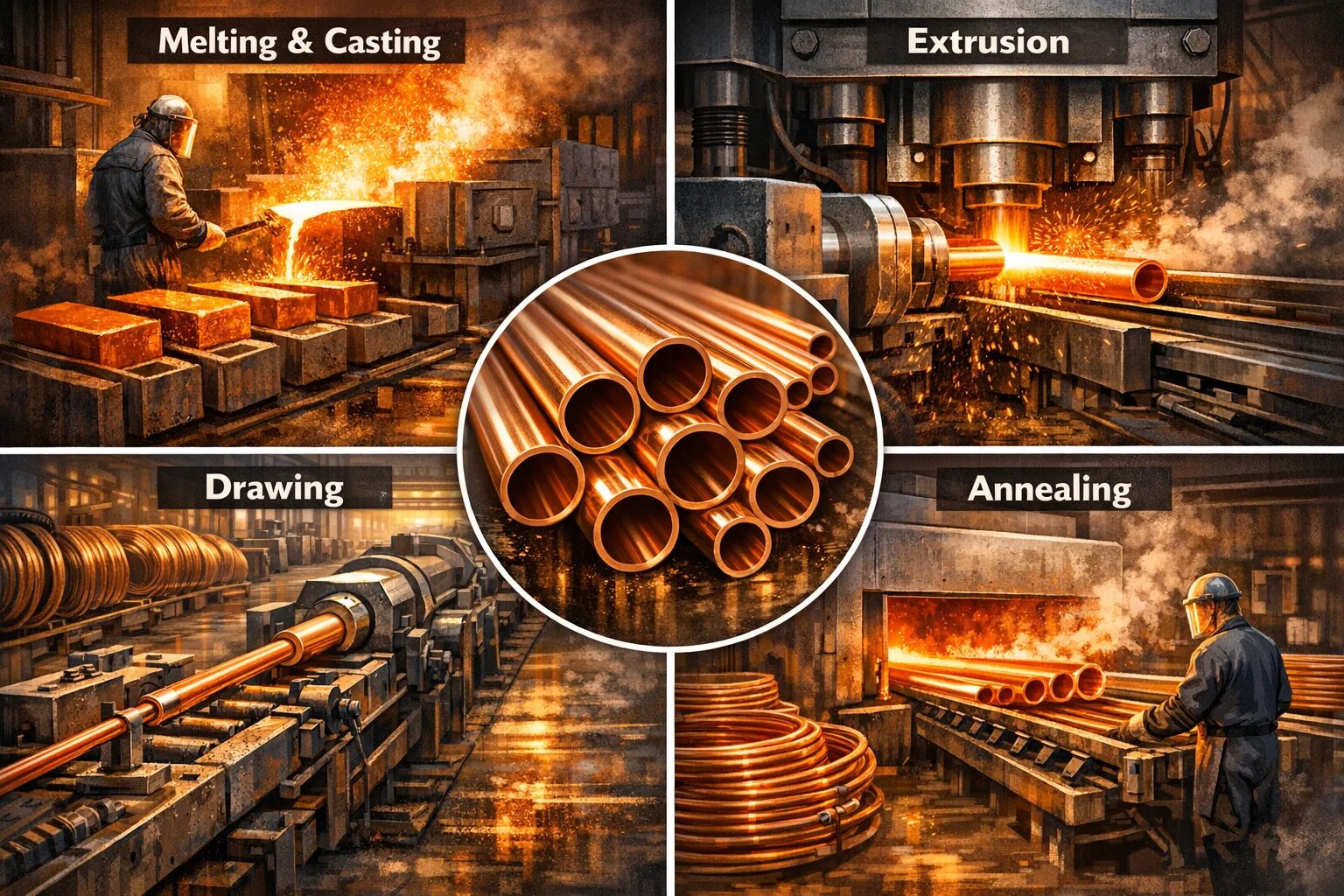 قدم زدن در یک کارخانه لوله مسی مانند ورود به دنیای آتش و دقت است. فرآیند تبدیل یک قطعه فلزی سنگین به یک لوله نازک و توخالی یک شاهکار مهندسی است. بیایید آن را به چهار مرحله ساده تقسیم کنیم: