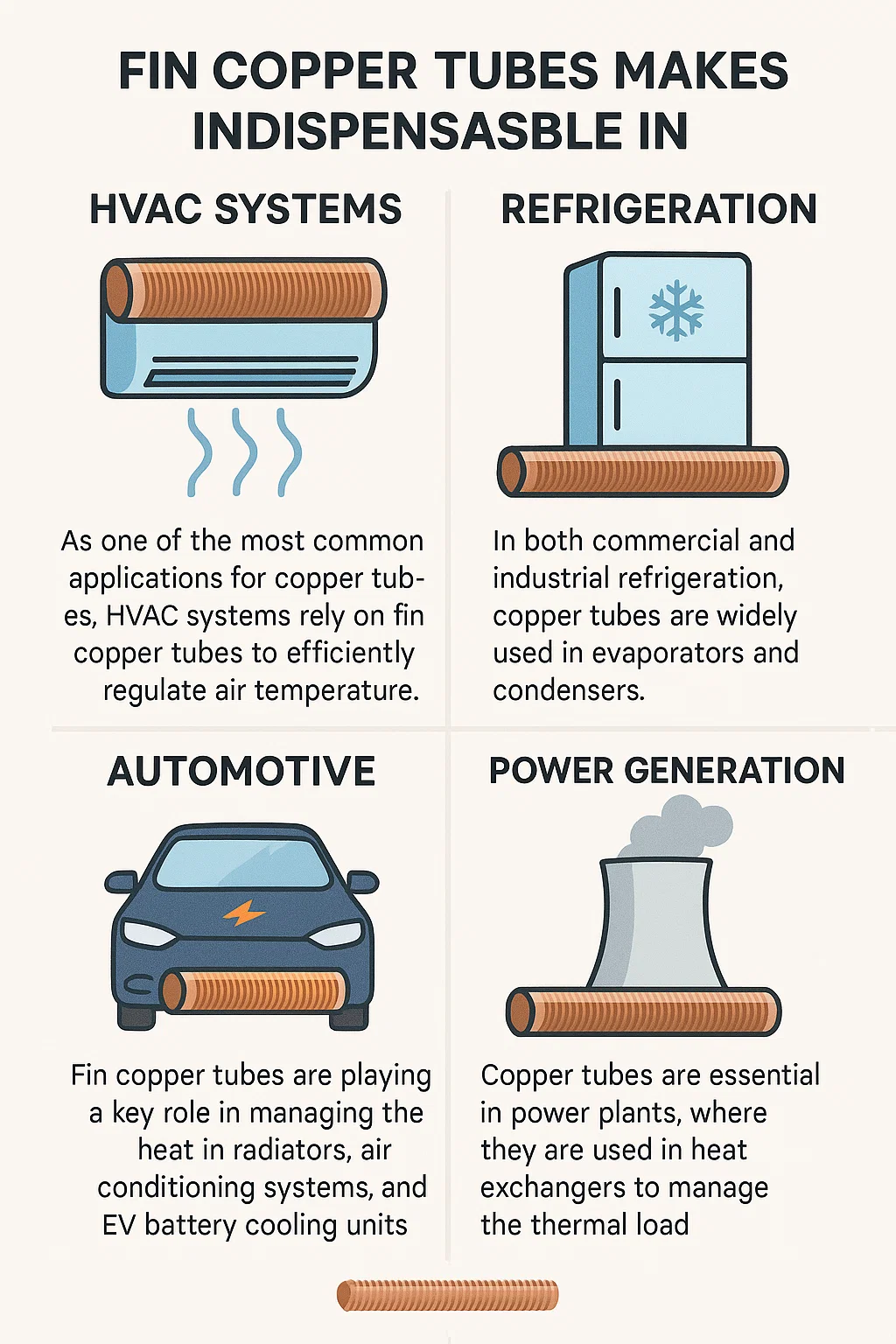 افزایش سطح ارائه شده توسط باله ها اجازه می دهد لوله های مسی پره برای بهبود مدیریت حرارتی در کاربردهایی که نیاز به دفع مقادیر زیادی گرما دارند، مانند سیستمهای تهویه مطبوع، رادیاتورهای خودرو، و واحدهای تبرید در مقیاس بزرگ. در چنین کاربردهایی، راندمان مبدل حرارتی به طور مستقیم بر عملکرد سیستم، مصرف انرژی و هزینه های عملیاتی تأثیر می گذارد، به همین دلیل است که لوله های مسی پره یک انتخاب ارجح برای مهندسان و تولید کنندگان است.