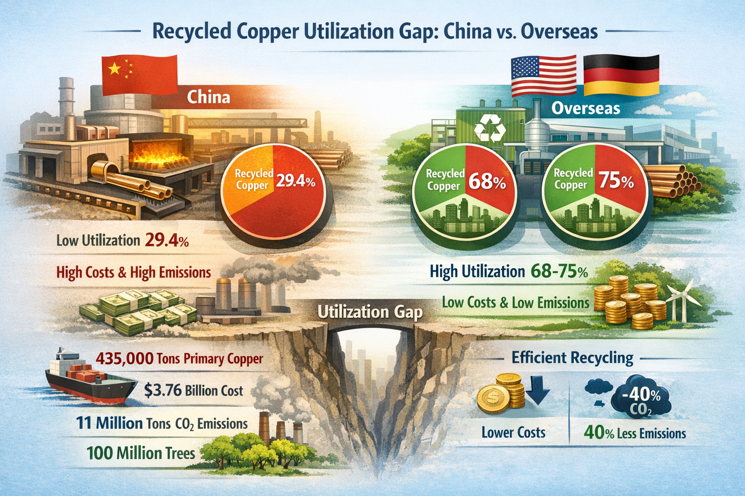 «تولید یک تن لوله مسی آقای ژانگ، مدیر تولید یک شرکت پردازش لوله مسی در ژجیانگ، می گوید: استفاده از مس بازیافتی در مقایسه با استفاده از مس بکر، نزدیک به 2000 یوان صرفه جویی می کند، و همچنین انتشار کربن را تا بیش از 80 درصد کاهش می دهد، اما ما جرات استفاده بیش از 25 درصد از مس بازیافتی را نداریم. معضل او منعکس کننده اضطراب جمعی صنعت لوله مسی چین در مسیر یک اقتصاد دایره ای است. بهعنوان بزرگترین مصرفکننده و تولیدکننده لولههای مسی، میزان استفاده چین از مس بازیافتی در بخش لولههای مسی مدتهاست که بین 28 تا 30 درصد در نوسان است، در حالی که در کشورهای توسعهیافته مانند ایالات متحده و آلمان، این نسبت به طور کلی از 60 درصد فراتر میرود و برخی شرکتها حتی به 80 درصد میرسند. از یک سو، ذخیره سالانه بیش از 12 میلیون تن منابع قراضه مس وجود دارد. از سوی دیگر، شرکت ها در پذیرش کامل مزایای مس بازیافتی مردد هستند. چرا صنعت لولههای مسی چین در تلاش است تا از سود سهام اقتصاد دایرهای ارائه شده توسط مس بازیافتی استفاده کند؟ پشت این موانع متعددی در سیستمهای بازیافت منابع، استانداردهای کیفیت، فرآیندهای فناوری و سیاستهای حمایتی نهفته است و همچنین کلید تحول سبز صنعت را در اختیار دارد.